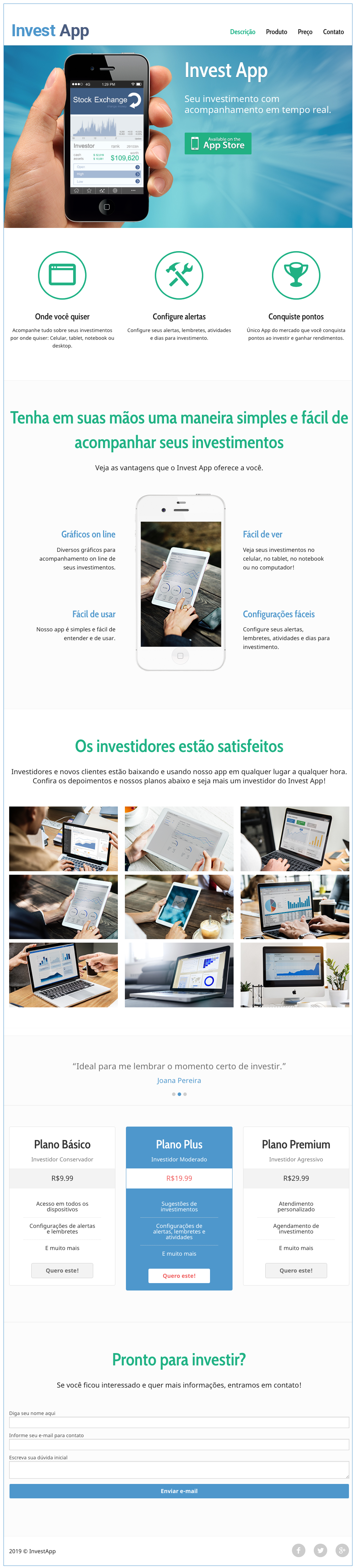 Estudo de protótipo em HTML para landing page de aplicativo de investimento.
